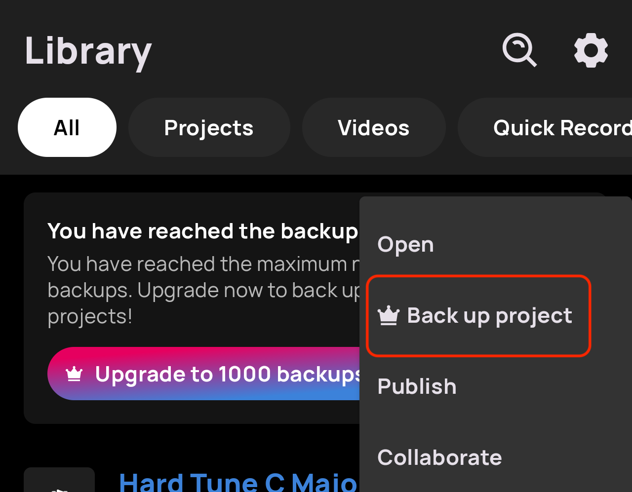 Note: If you have Voloco Premium (20 backups), you'll see a crown icon on "Back up project" for projects that aren't yet backed up, indicating you can upgrade to the Project Backup add-on for up to 1,000 backups.