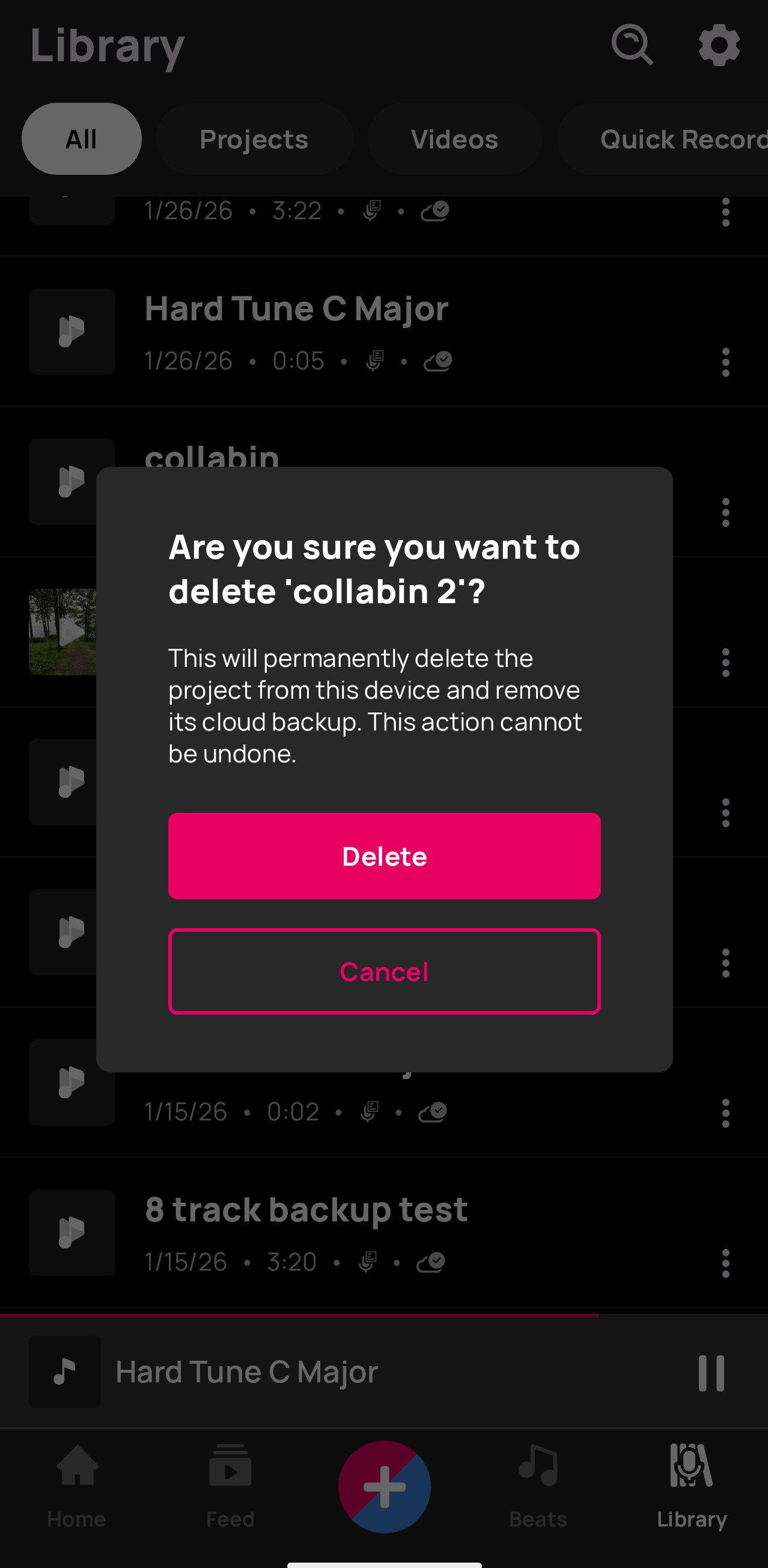 When you delete a project that has a cloud backup, both the local project and the cloud backup are deleted.
